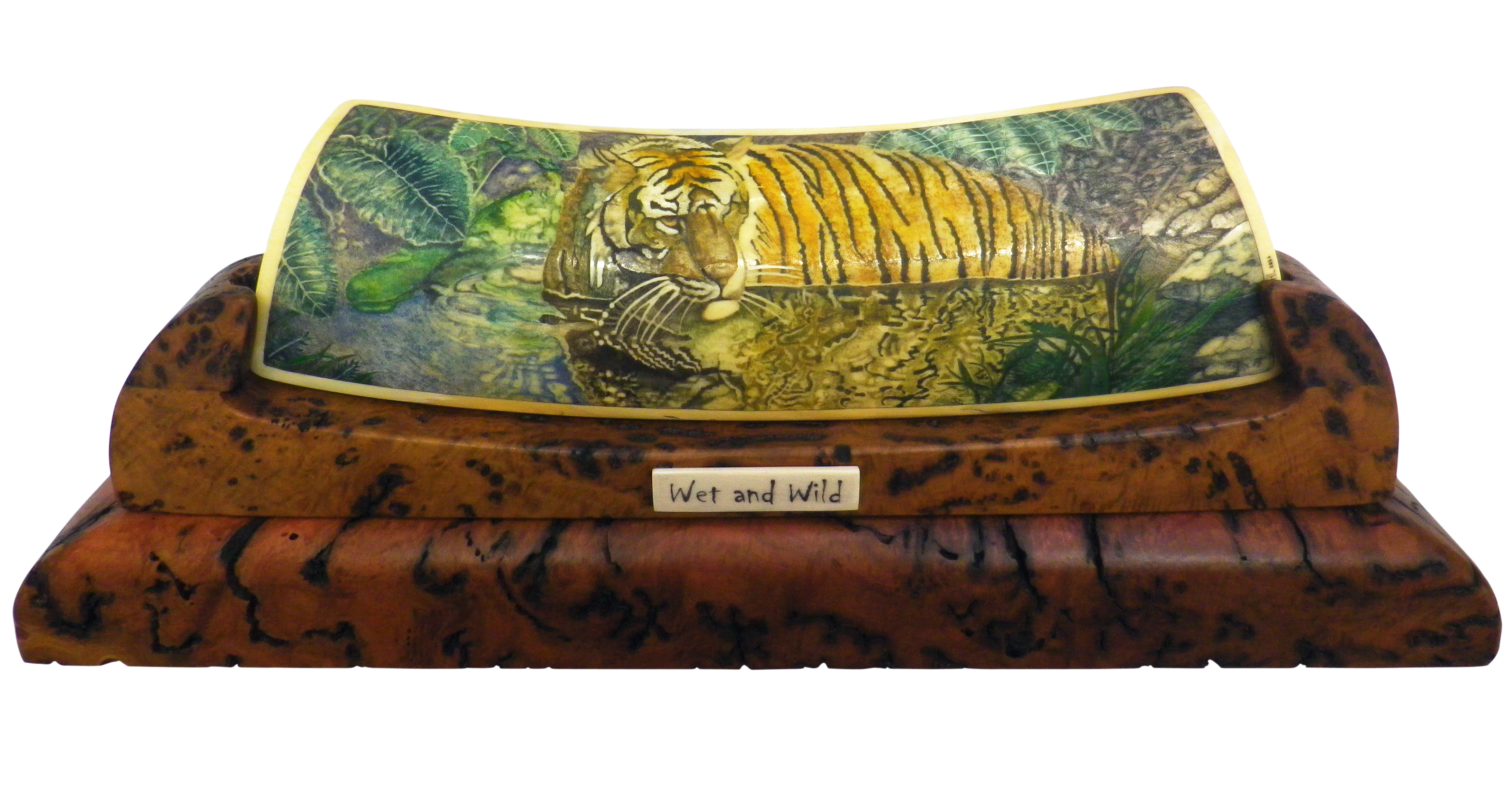 Biography: I do Scrimshaw as a hobby. It’s been an addiction for about 22 years. I use the stippling method and have recently moved into colour scrimshaw. I don’t do commission work. Once I finish a piece I can’t sell it, that would be like selling a child.