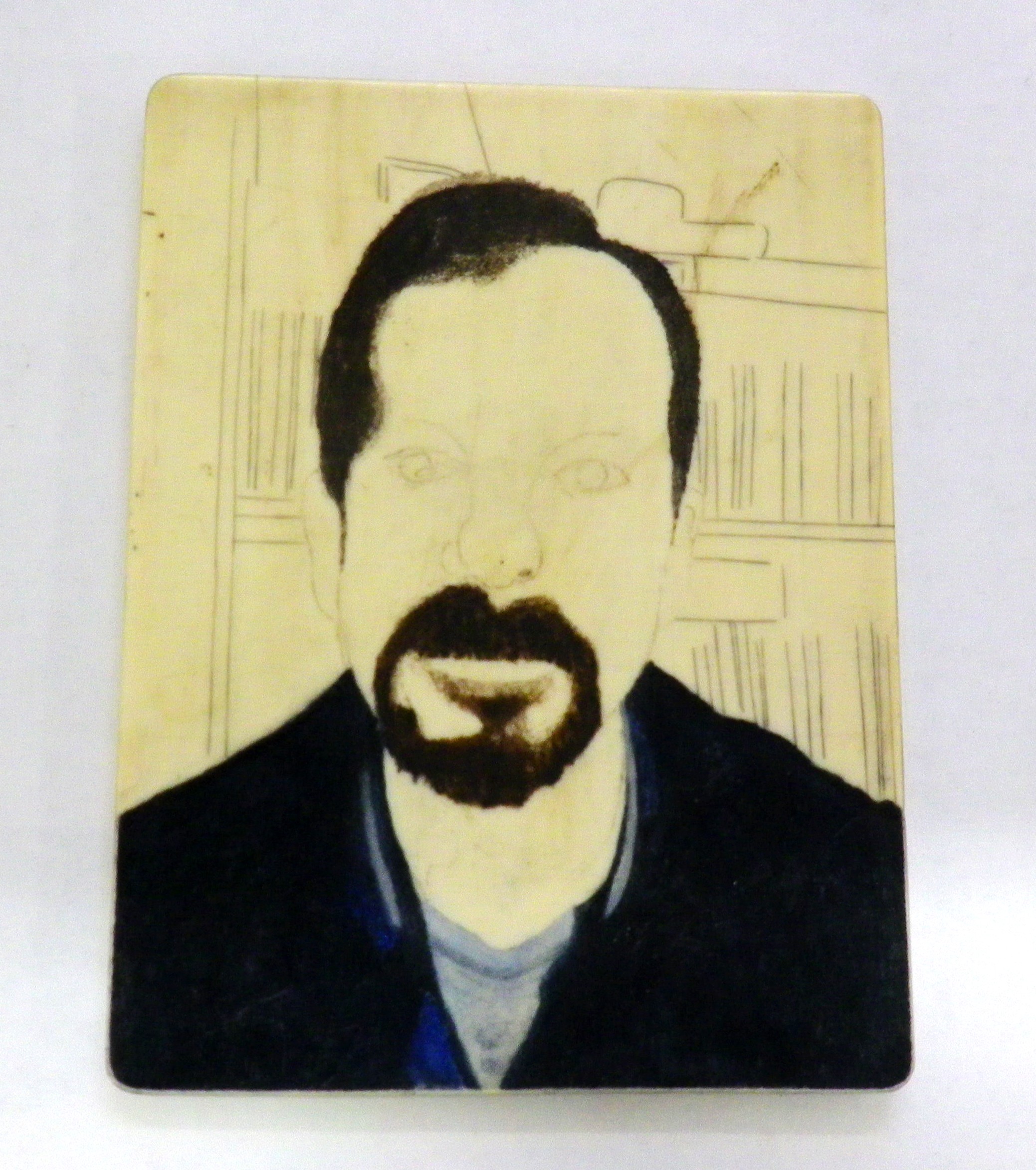This is the Galalith with the outline cut out and Andrews’s hair and beard scrimshawed. It stipples quite well. The surface is unusual to work on and instead of chipping away like ivory to leave a clean hole, it pushes the surface up and becomes rough like a meteor crater. Once the paint is applied and rubbed in though, it acts similarly to ivory. I’m used to working on a curved surface because that’s how most ivory comes. That means you can only see the light reflected in the spot you’re working with one eye. Because the Galalith is flat though, it’s much easier to see everything.