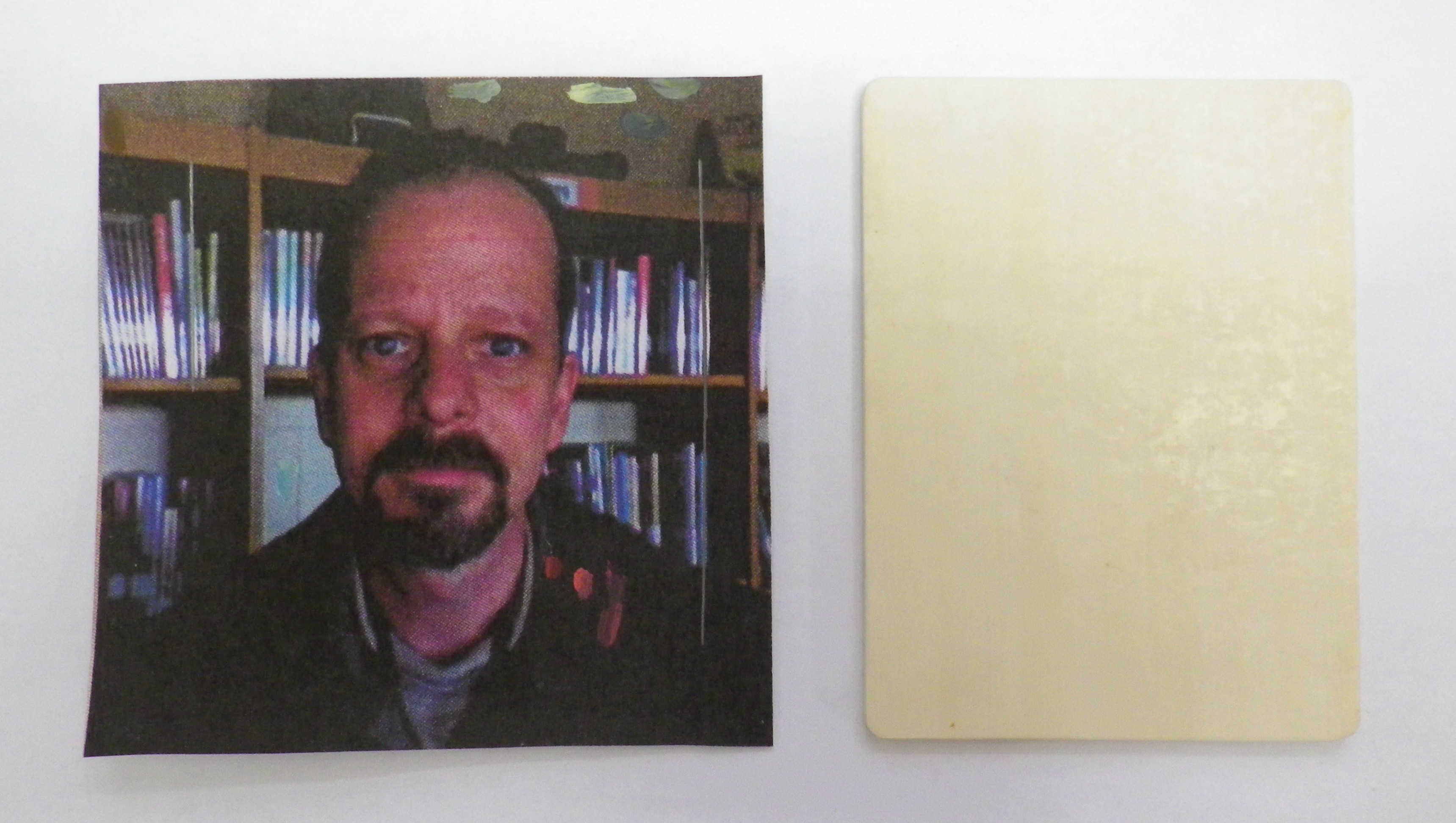 This is a piece or Galalith (synthetic ivory made by mixing Casein and Formaldehyde). It was sent to me by Andrew Perkins (www.scrimshaw.com) to test how it scrimshaws. This is a picture of Andrew I found on the back page of his book – “Scrimshaw? But I Can’t Draw! How to Scrimshaw Volume 1”.