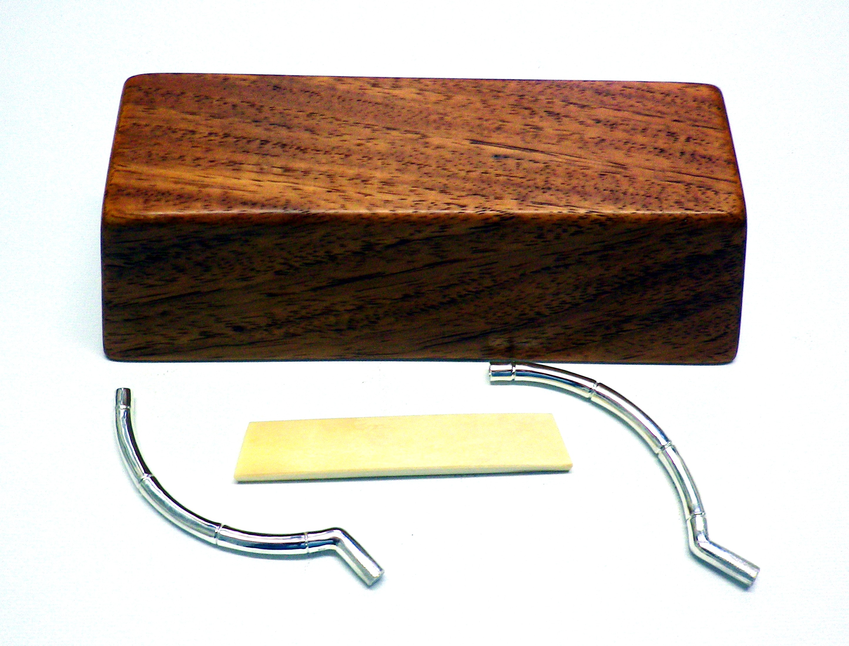 These are the different components: The Rosewood Base, the Sterling Silver Arms to hold the scrimshaw (weight 71 grams) and the Mammoth Ivory Name Plate.