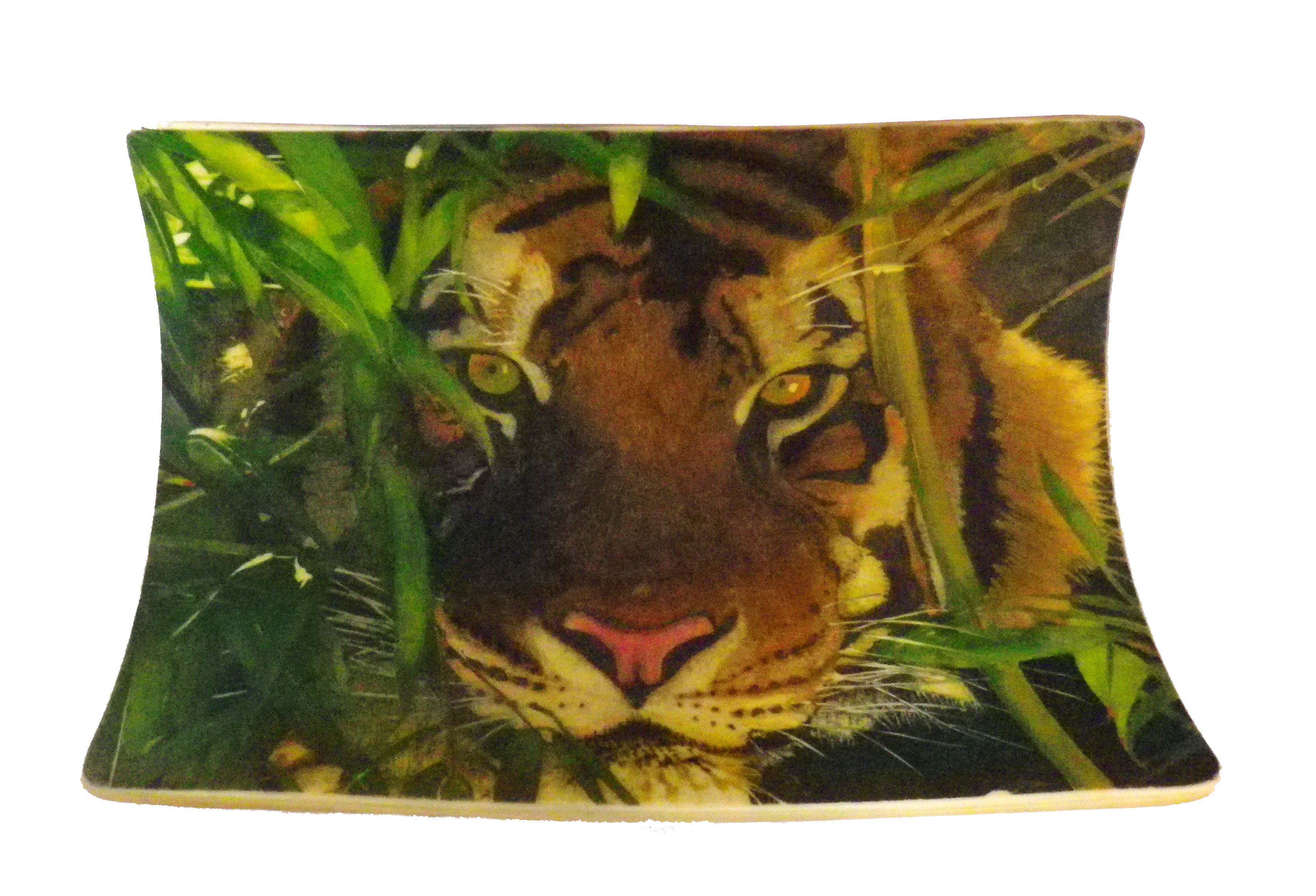 I love this picture of the Tiger looking out from behind the bamboo. The orange and black of the tigers face contrast nicely with the green bamboo leaf border.
