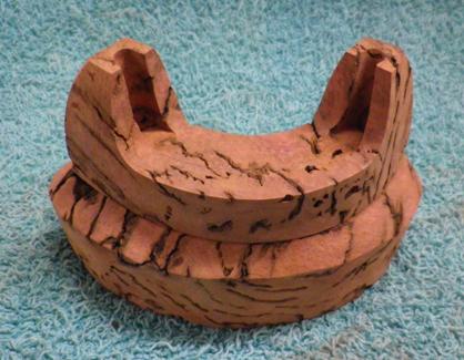 The pictures are pretty self explanatory but I’ll describe what I personally do anyway. I roughly cut my chosen wood with a band saw and drill notches for the ivory. After that I sand it with a belt sander, then with 180 grit and 600 grit on an orbital sander. Next, I sand it by hand and rub it with ‘Eee Ultra Shine’. My first stands were made by hand using a saw and file, but it took forever; sometimes even longer than the actual Scrimshaw. For examples of top quality Bases/Stands go to www.scrimshawgallery.com.
