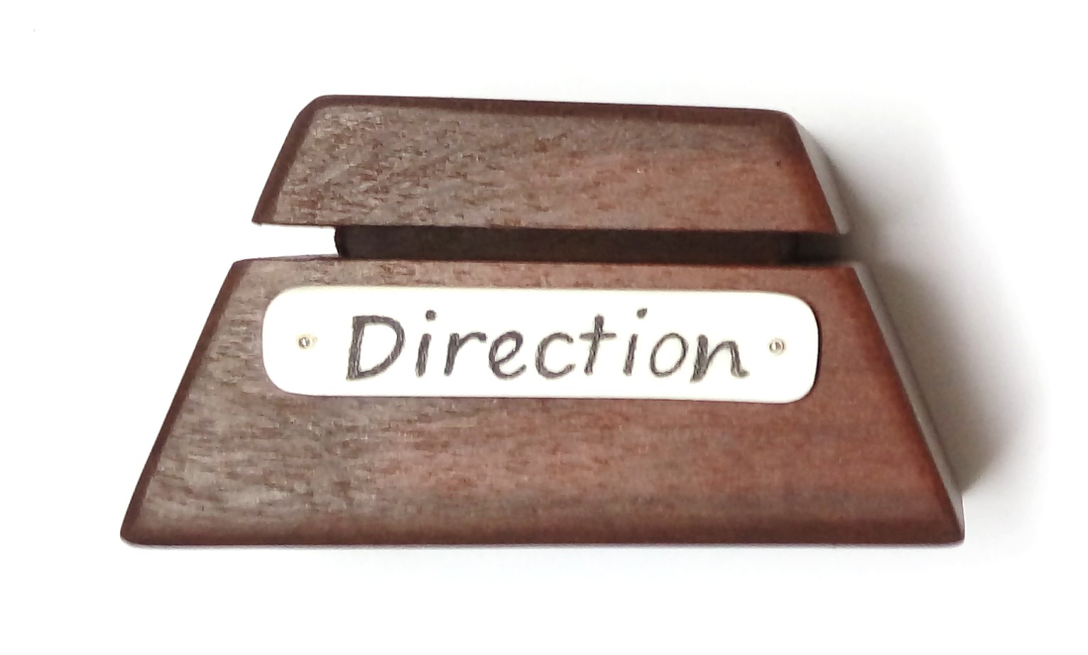 The base is made from an unknown wood with an Ivory name plate attached using Sterling Silver pins.