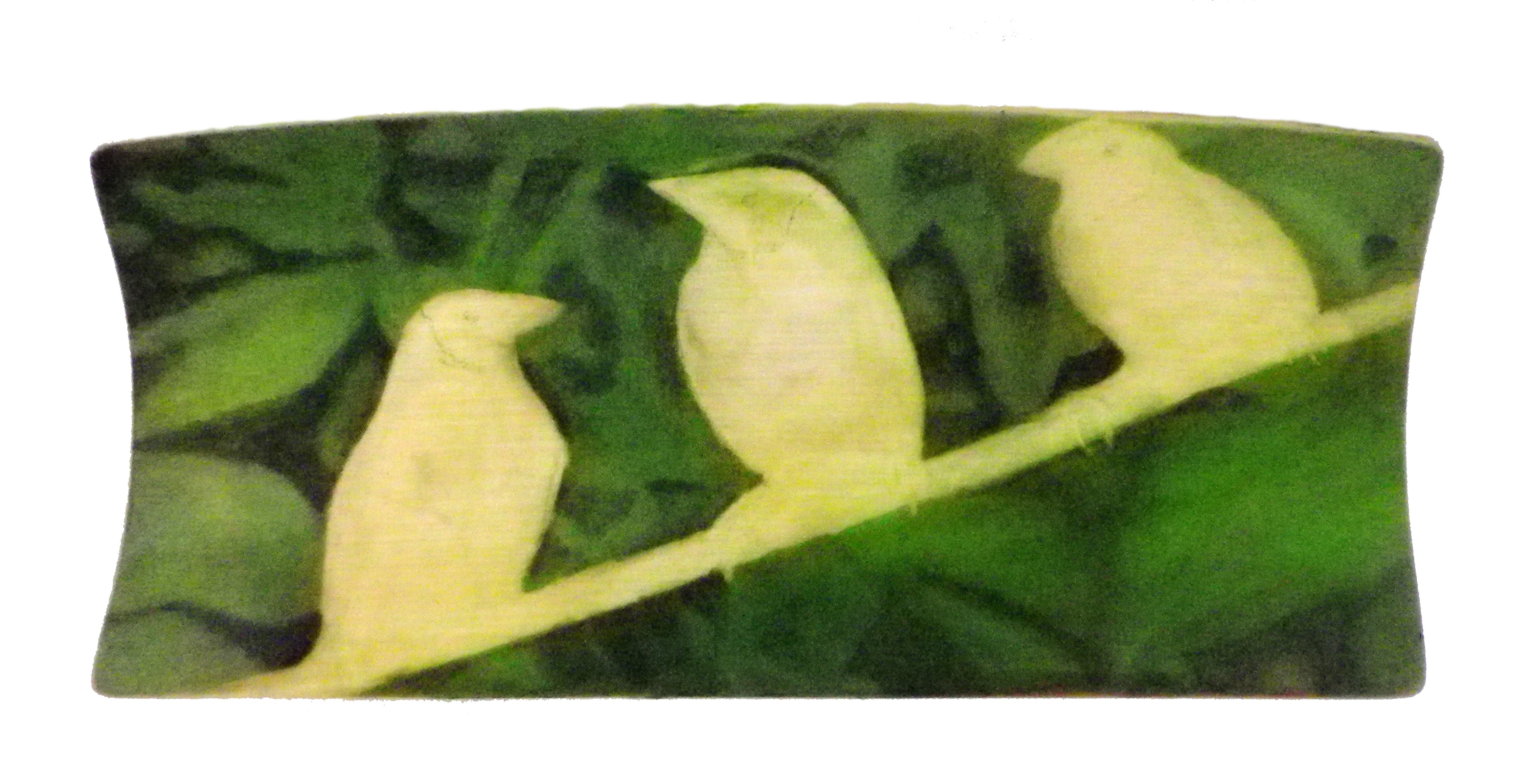 This is the ivory with background foliage added. The dark green of the leaves and the black shadows should make the finches really stand out. Scrimshawing a background that’s out of focus and blurred is hard and it takes a while to find the right effect.
