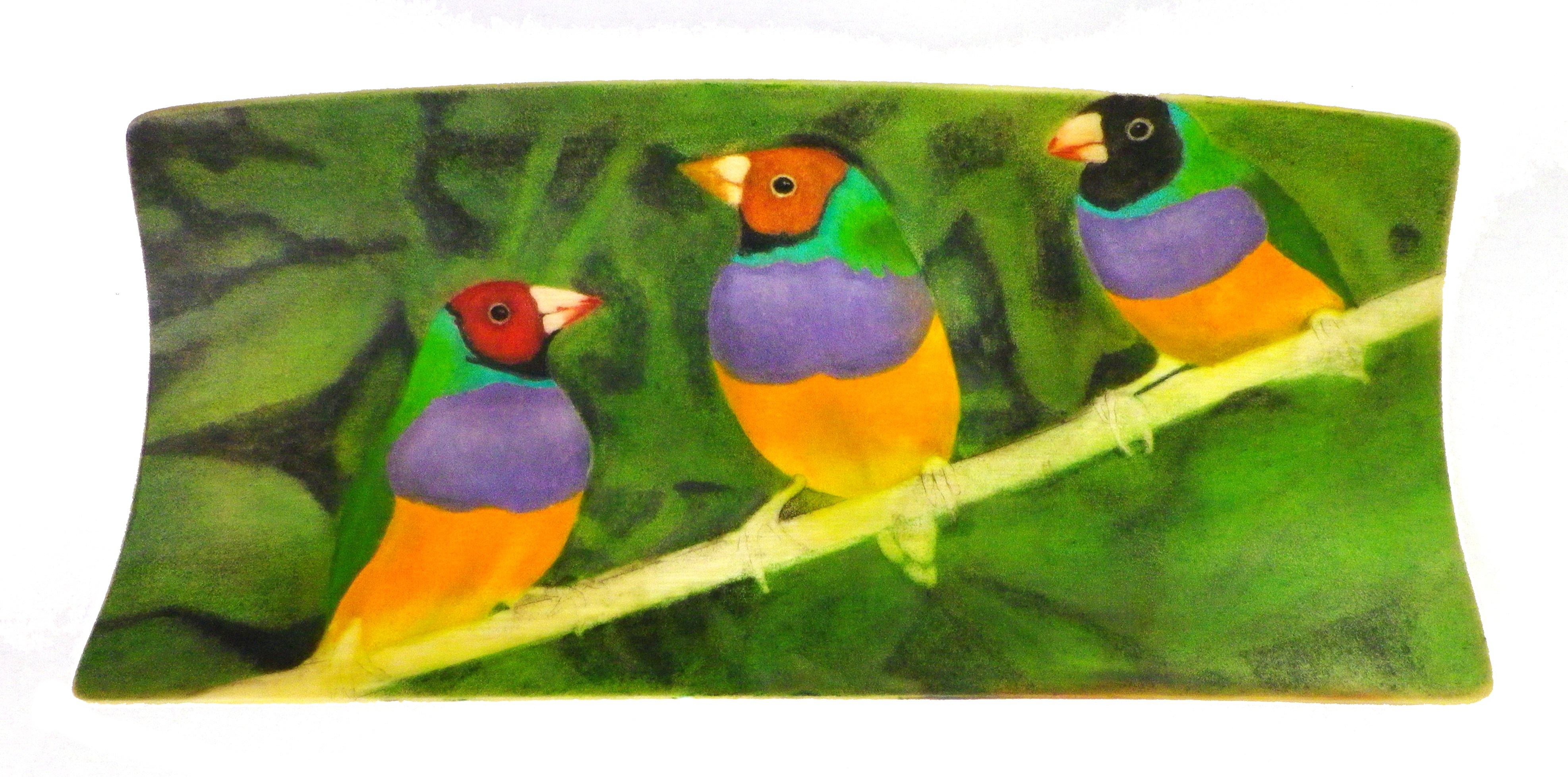 This time I’ve decided to scrimshaw three Gouldian Finches because of the striking colourations.