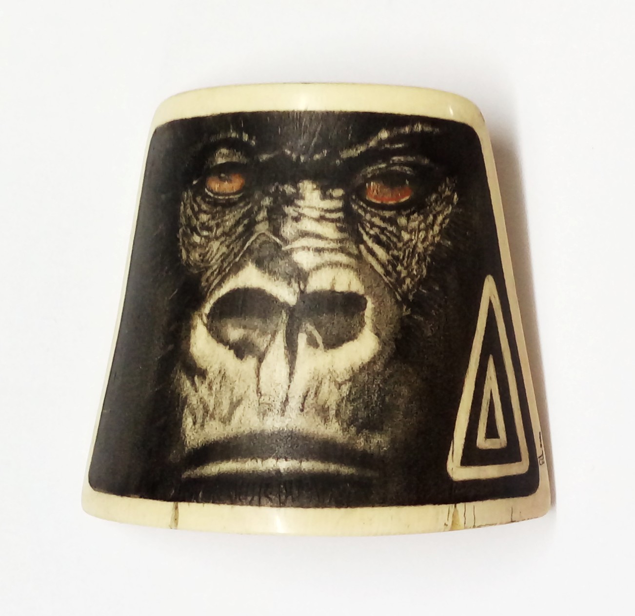 This simple scrimshaw of a Gorilla was done in 2013. It was the first of my pieces to have colour added. The Ivory is ancient fossilized Mammoth Ivory from Siberia. It weighs 53 grams and measures 90mm wide x 70mm high.
