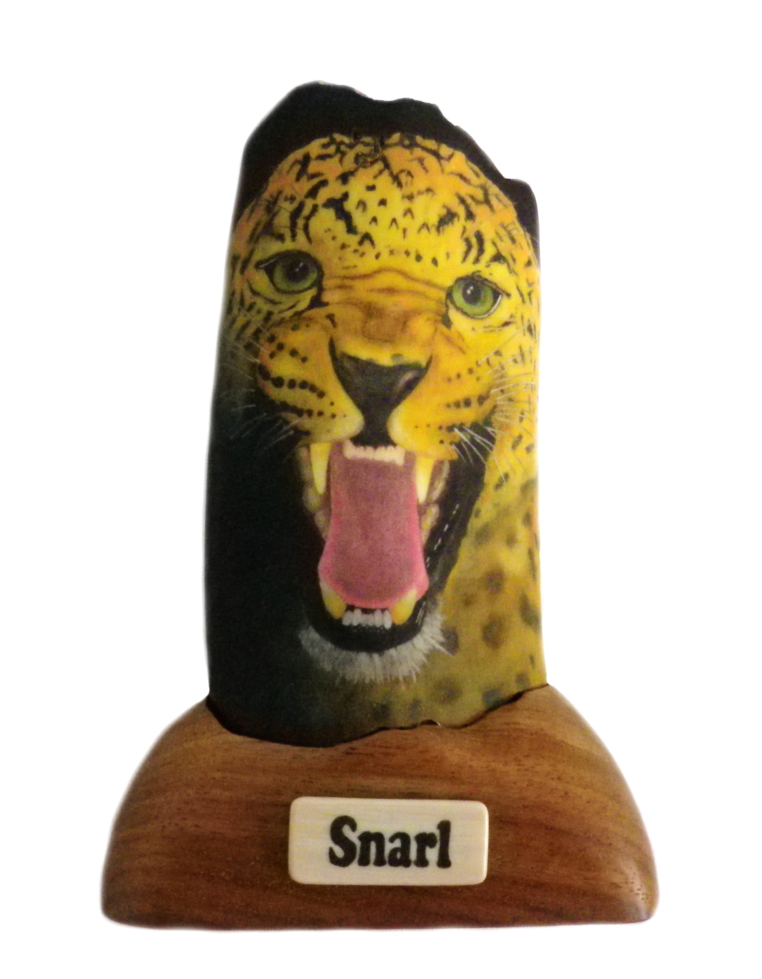 The base is fashioned from a piece of Rosewood which wraps around the walrus ivory. The nameplate is made from Mammoth ivory and is scrimshawed with the title – “Snarl”.