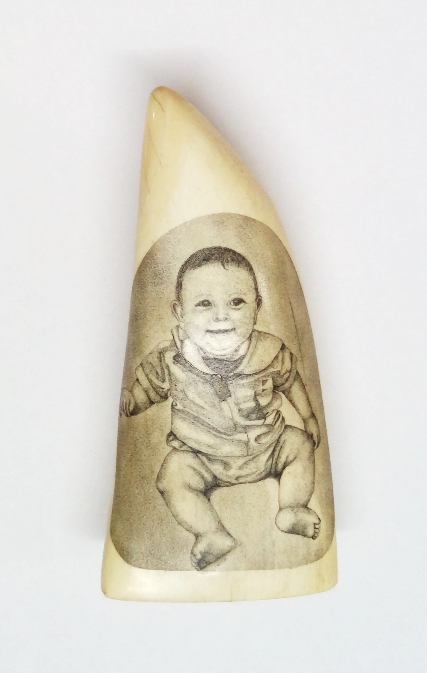 This is a Scrimshaw of my son I did on a Sperm Whale Tooth in 1995. The tooth weighs 275 grams and is 60mm wide x 130mm high.