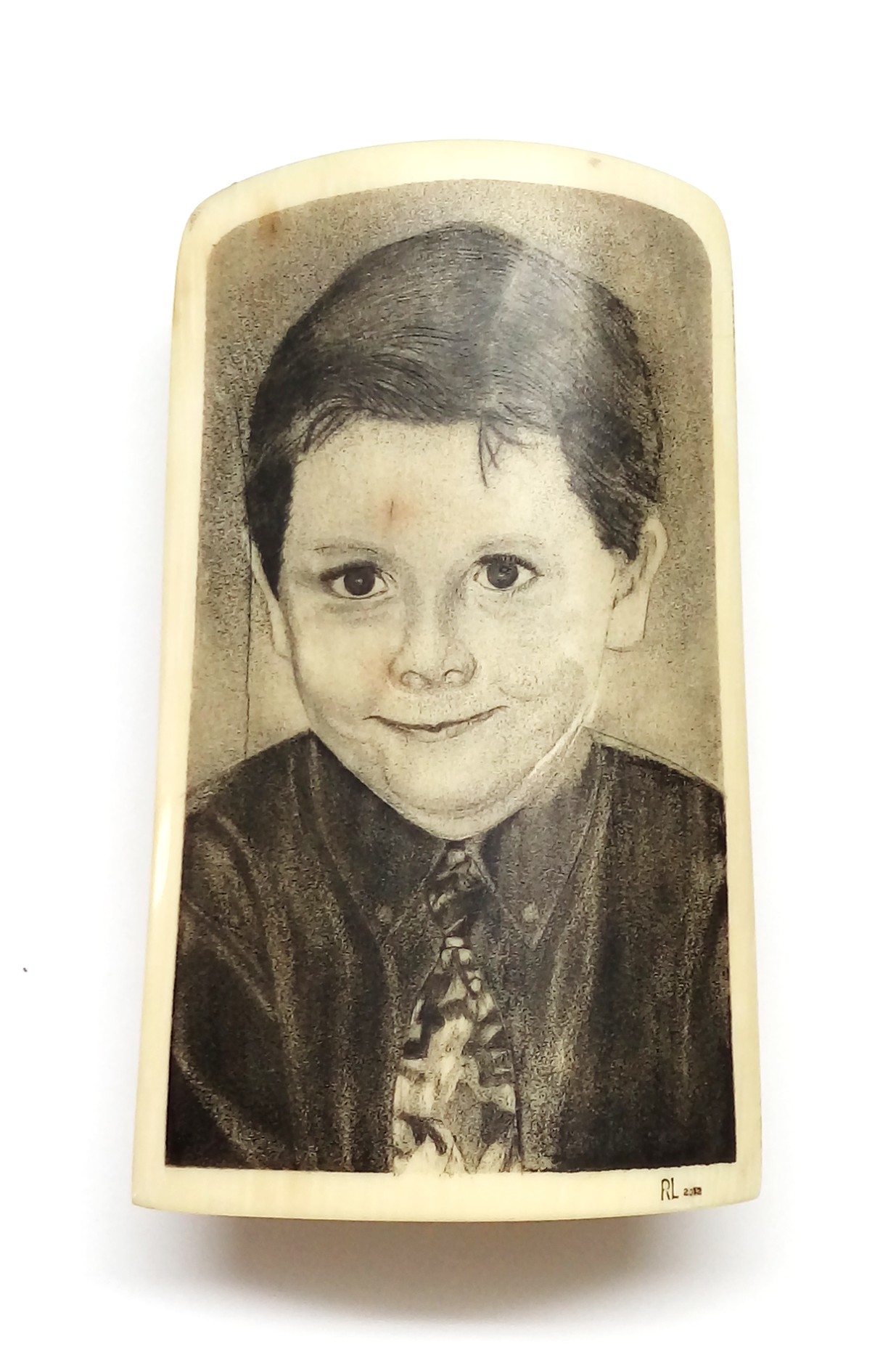 This Scrimshaw is of my son it was done in 2012 using black ink and the sandblasting technique. The Ivory is ancient fossilized Mammoth Ivory from Siberia. It weighs 267 grams and measures 70mm wide x 115mm high.