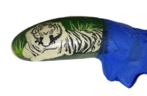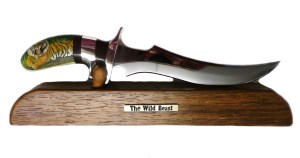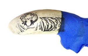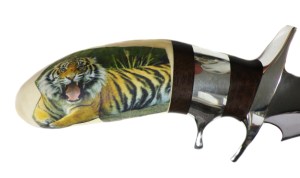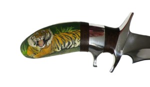 This picture shows the Tiger cut out and black paint applied. I have masked the remainder of the knife with masking tape so as not to mark the knife as I work.