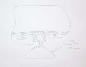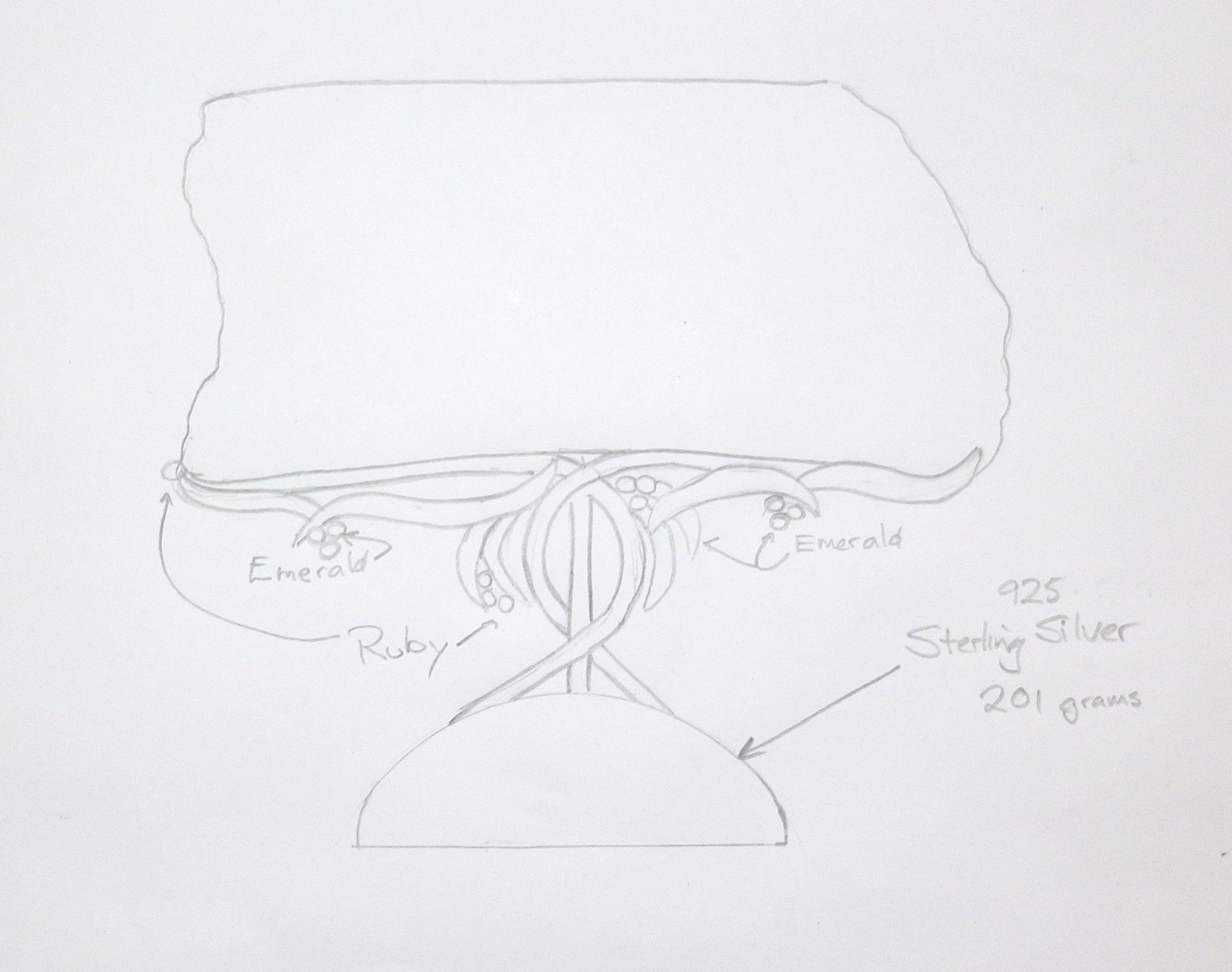 Now for the base, I’m going overboard with this base, I will fashion it in 925/Sterling Silver with gemstones set in small flowers, a real jungle theme. This picture is a simple sketch of the intended base.