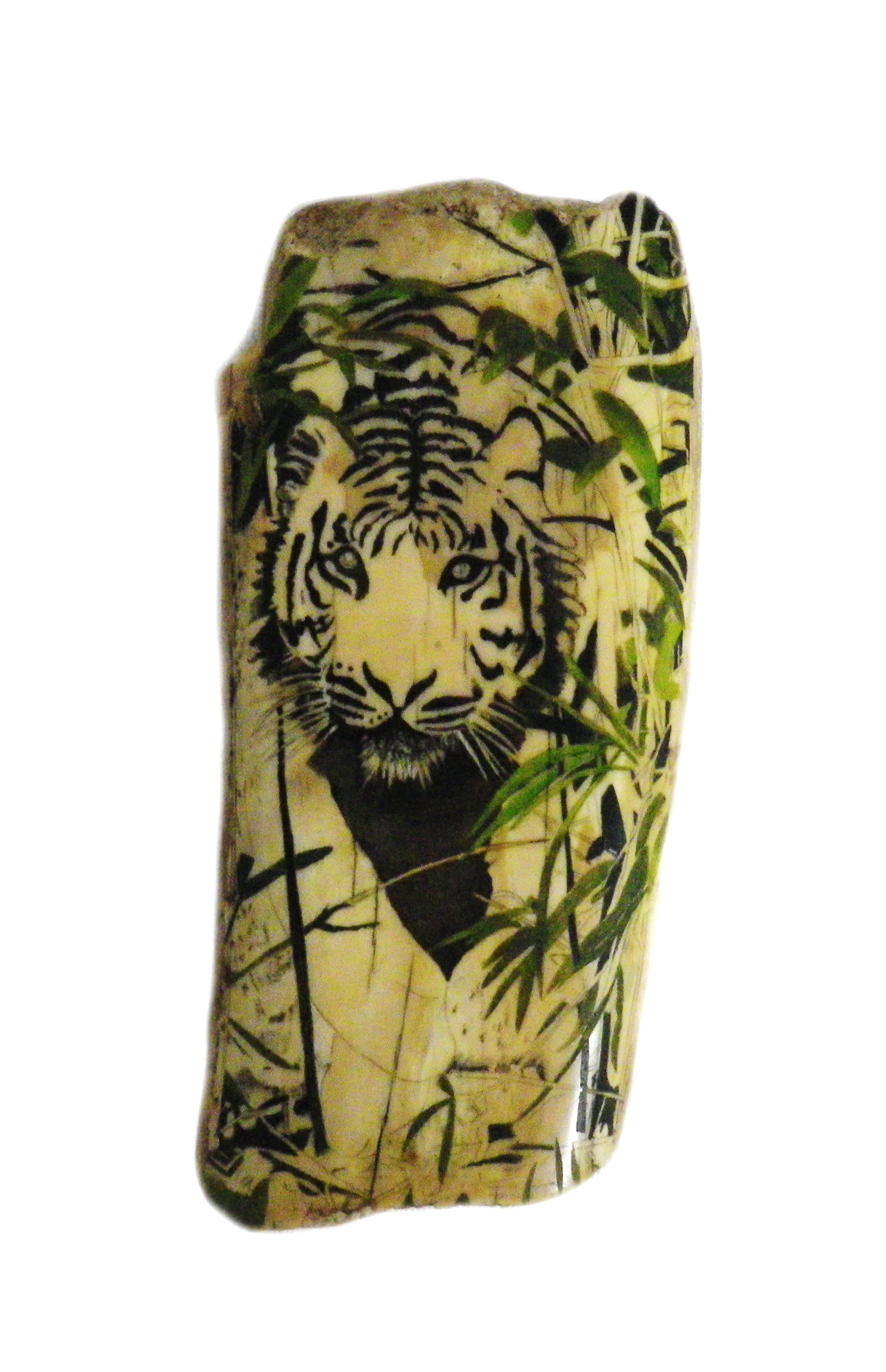 I’ll do this Scrimshaw on a piece of ancient Walrus ivory which weighs 289grams and measures 14cm x 7cm. It’s a little stained but should scrim OK. The look of concentration on the Tiger should make it something special.