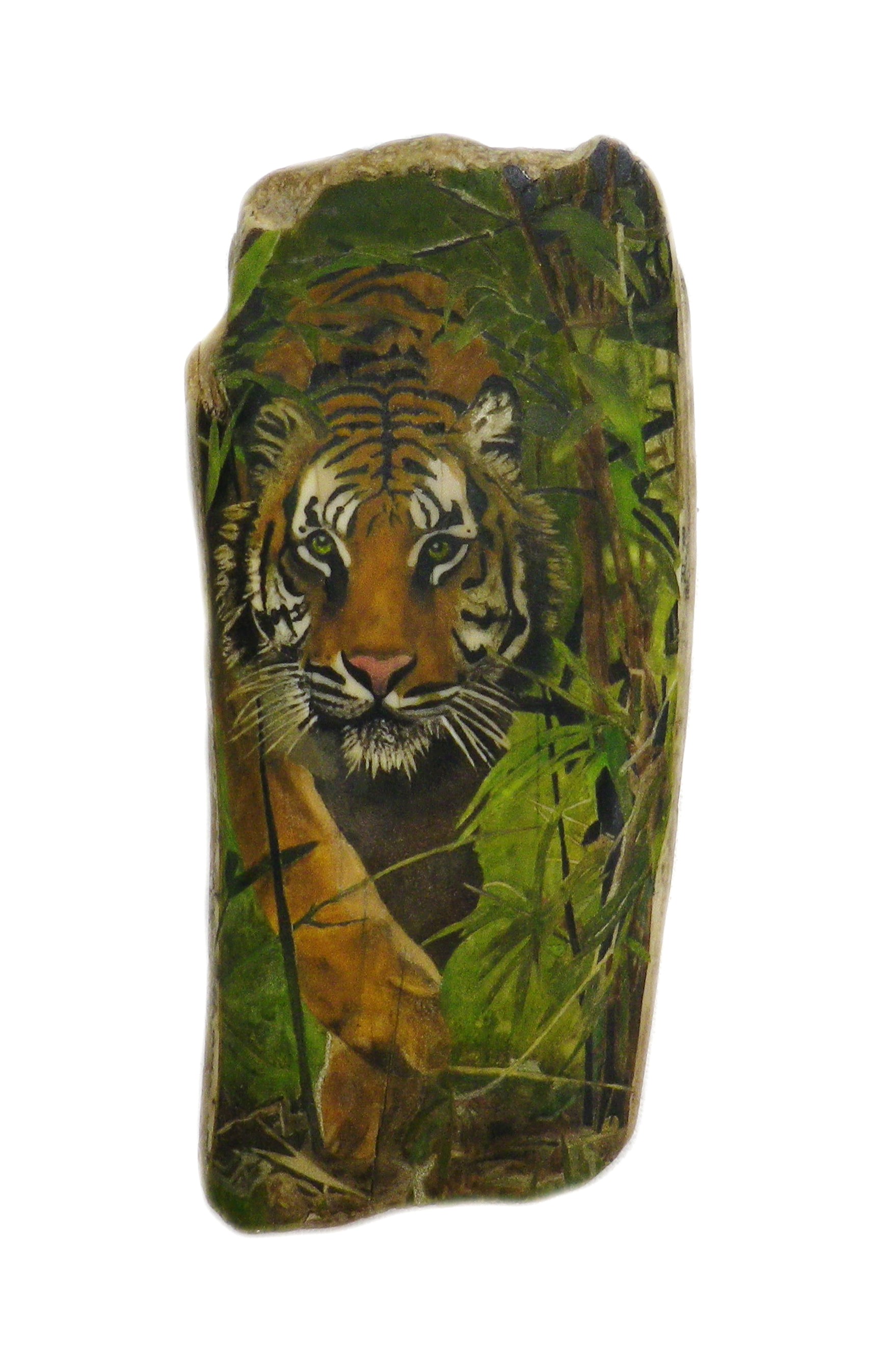 Finished at last, the stain from the fossilization process has disappeared under the paint of the face; I am impressed with how it has turned out; the composition of the tiger is just right. Truly a “STALKER”