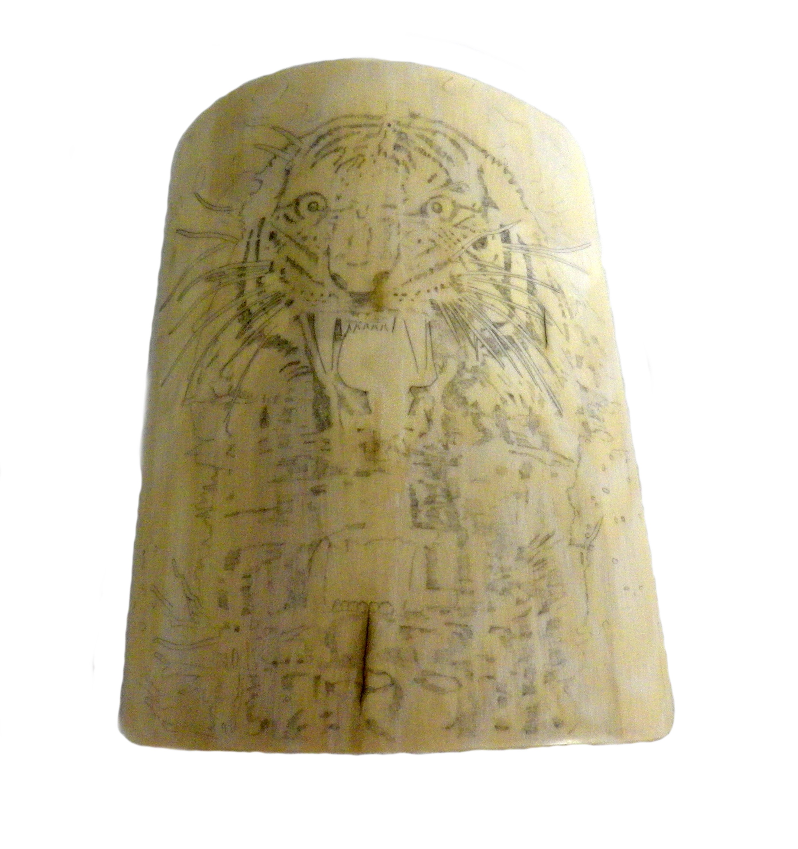 9 hours later and the tigers head is scrimshawed; the piece is starting to take shape. The more detail you put in when cutting the basic outline, the easier it is when it comes to adding intricate details. Next to be done is the reflection.