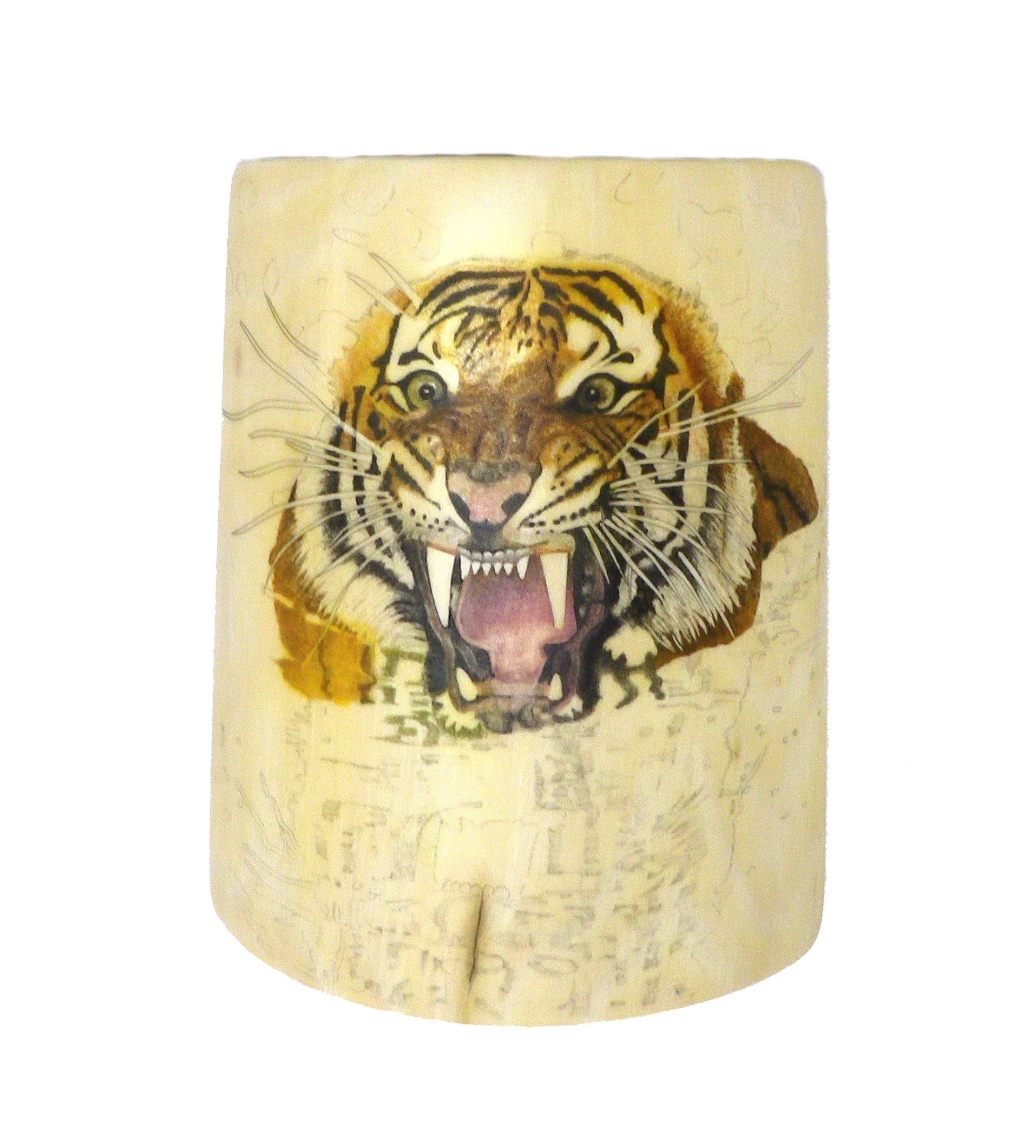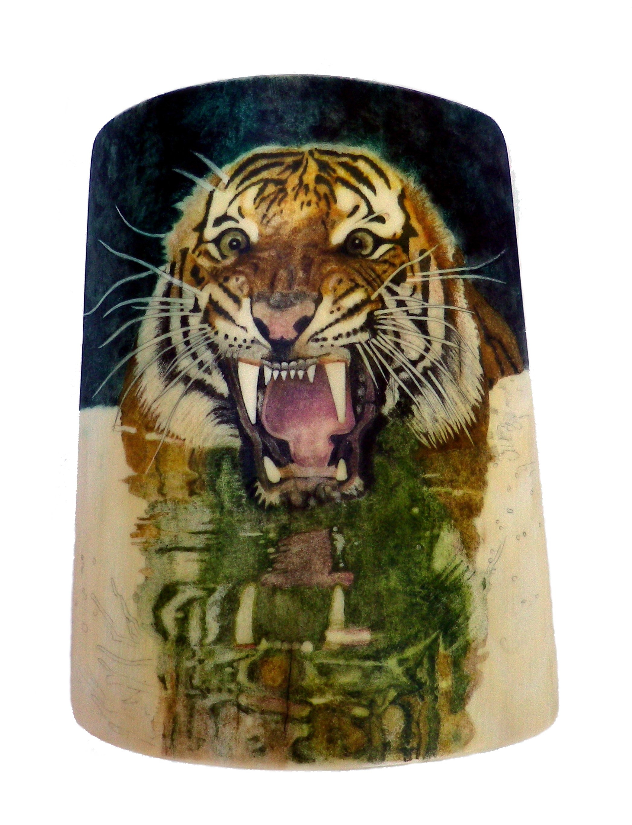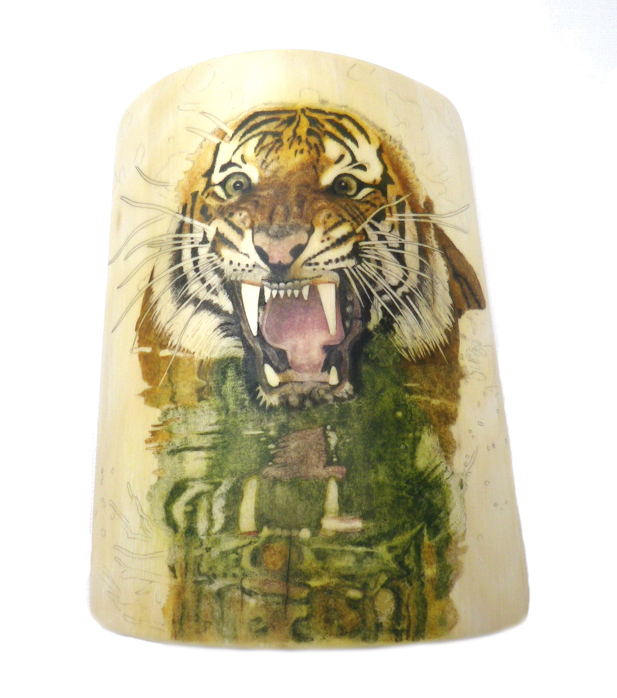 I chose to scrimshaw this because it’s unusual – just the tigers head and reflection are visible. I love the expression on its face and the wild whiskers.