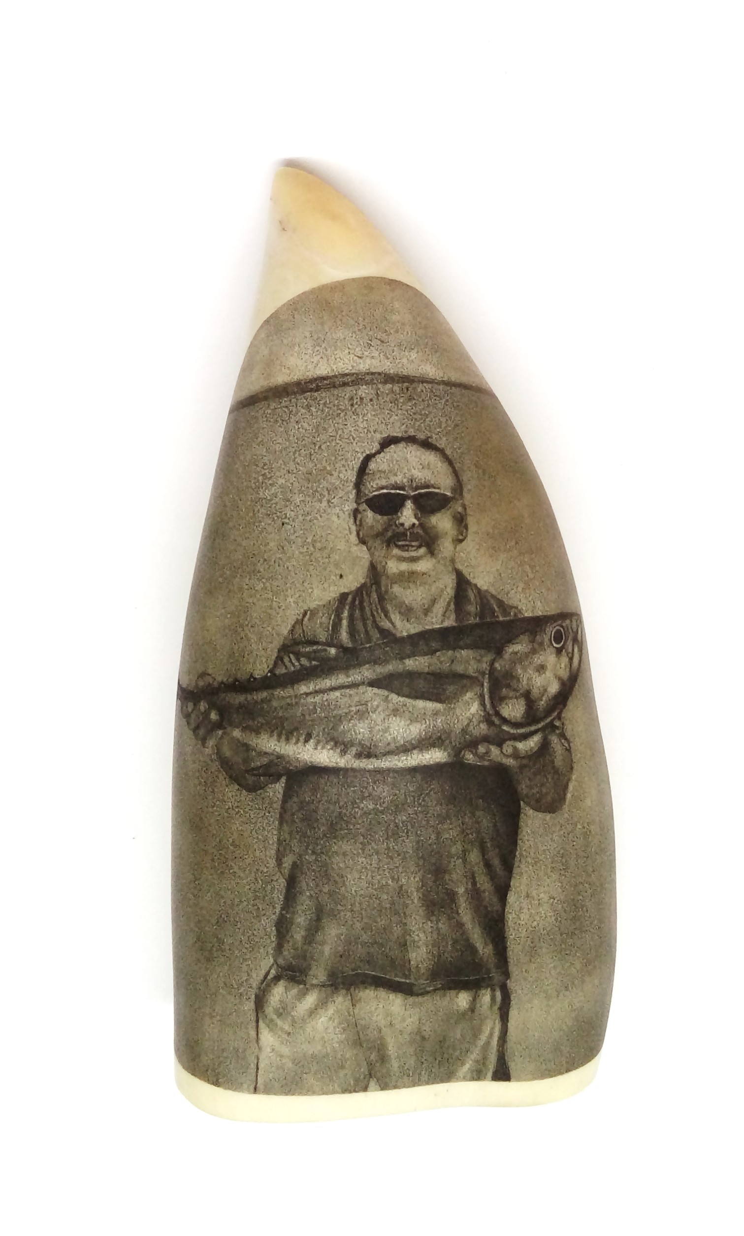 This is a self-portrait, Scrimshawed in 2012. The fish is called a “Northern Blue Fin.” It was caught trawling lures in Gove bay, NT during the winter. They were that plentiful that we got sick of catching them.