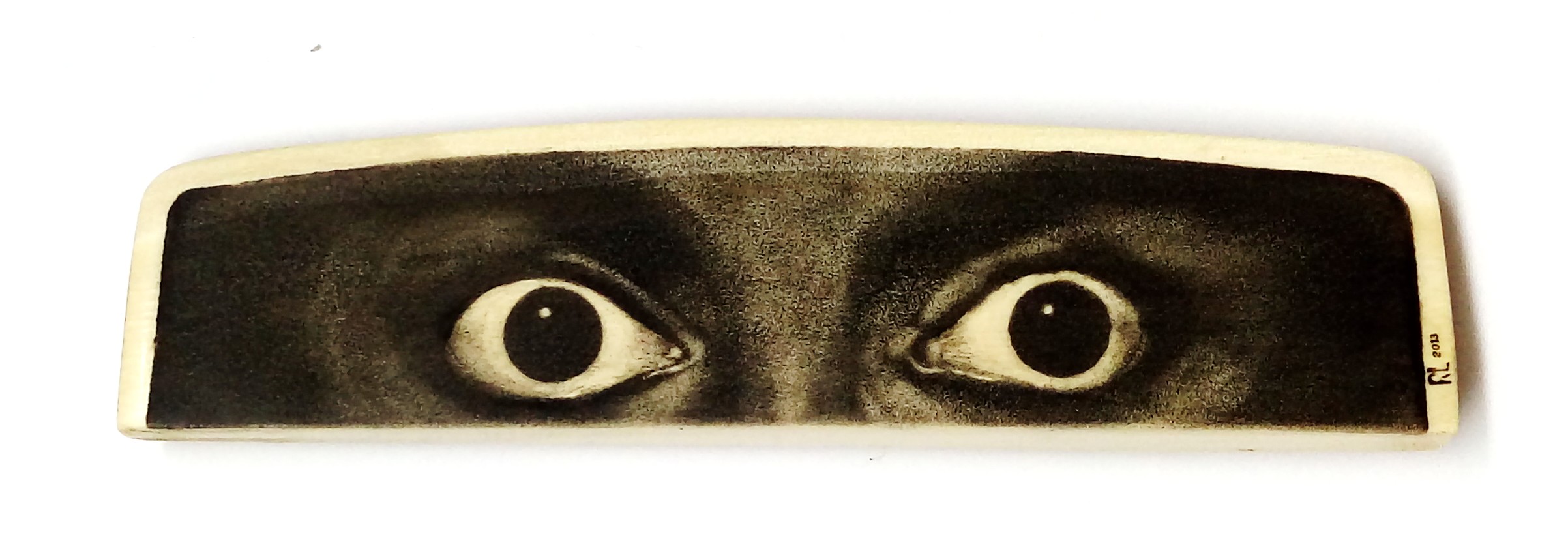 This Scrimshaw of eyes looking at you was done in 2013 using black ink. The Ivory is ancient fossilized Mammoth Ivory from Siberia. It weighs 61 grams and measures 130mm wide x 30mm high. The shape is called a “plaque”. That means that it’s flat with even sides which is the most desirable ivory to work on.