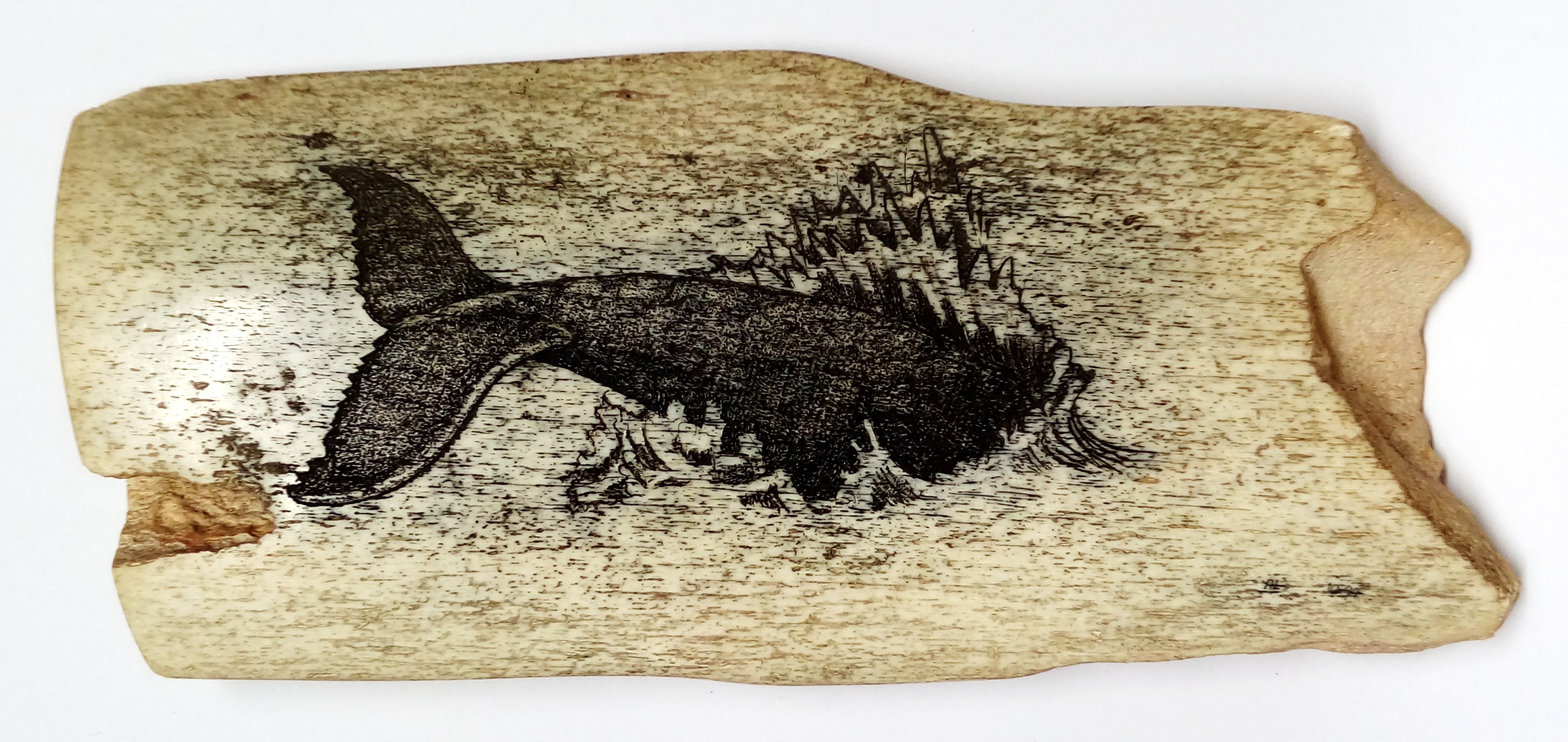 This scrimshaw is of a breaching whale. It was Scrimshawed in 1994 using black ink on whalebone, which is very porous. I had to be extremely careful when inking as the ink would soak into the bone and blur the picture. It weighs 487 grams and measures 210mm wide x 90mm high.