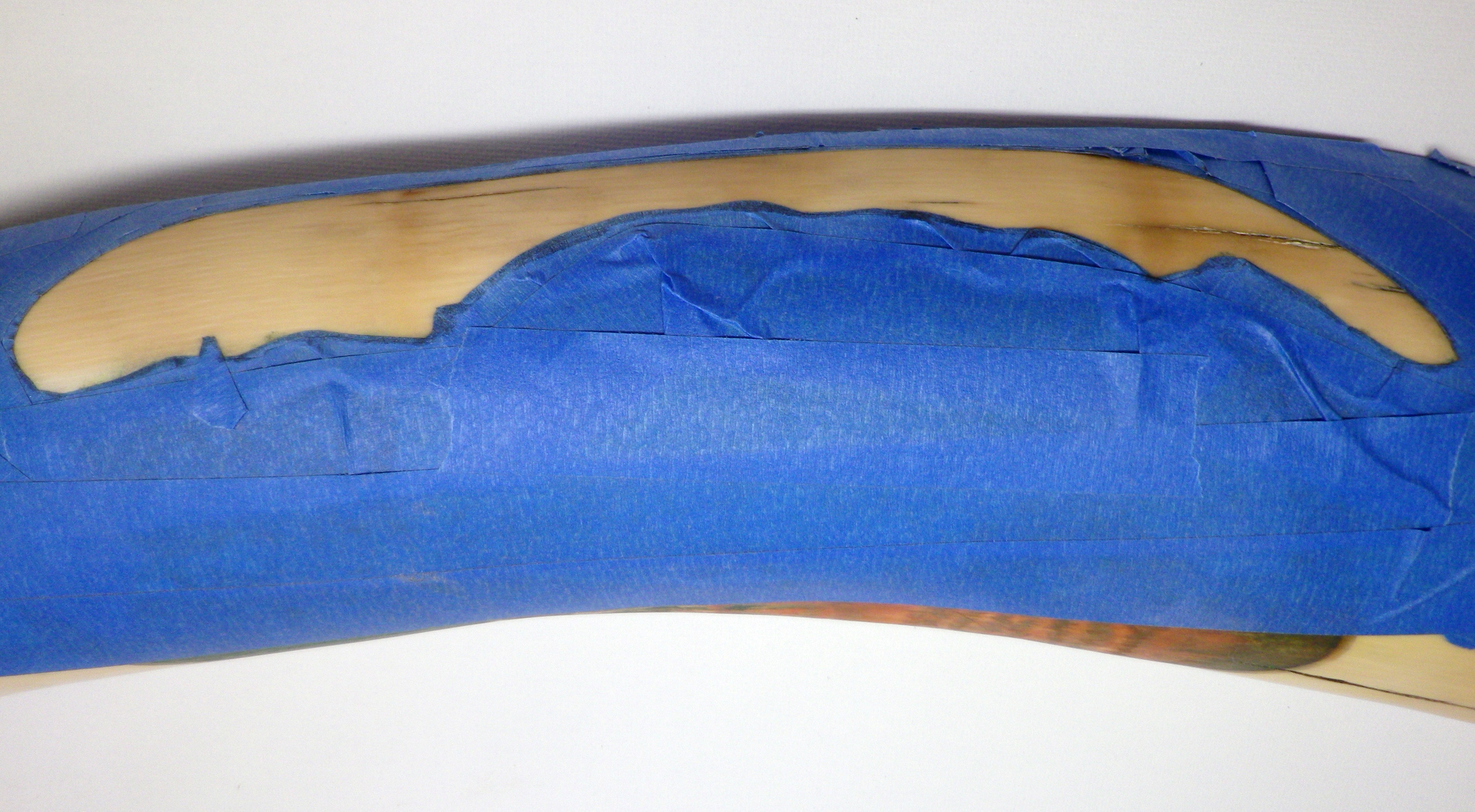 Although the back is very rough looking, the front sanded down very nicely. Unfortunately, a large hole appeared while sanding but because large pieces like this are hard to get I wasn’t going to reject it. I patched the hole by carving a similar piece of ivory and fitted it into the hole with high strength epoxy resin. I think it’ll Scrimshaw nicely but only time will tell.