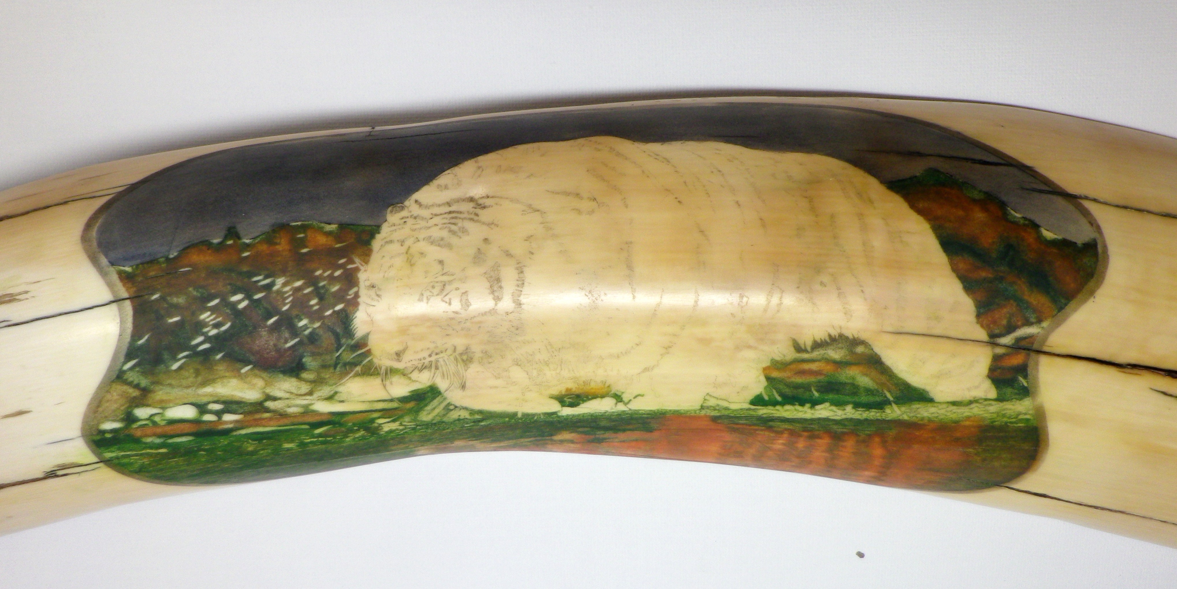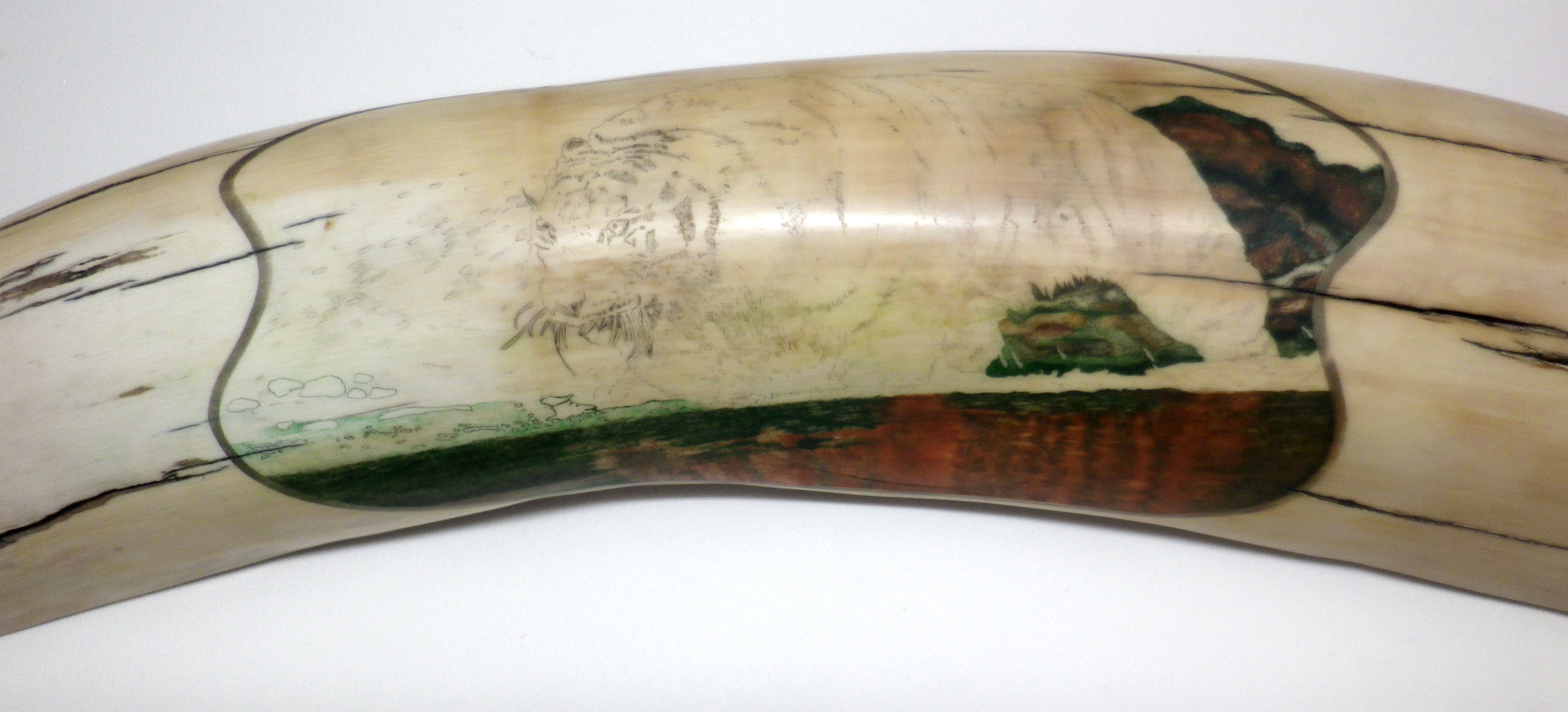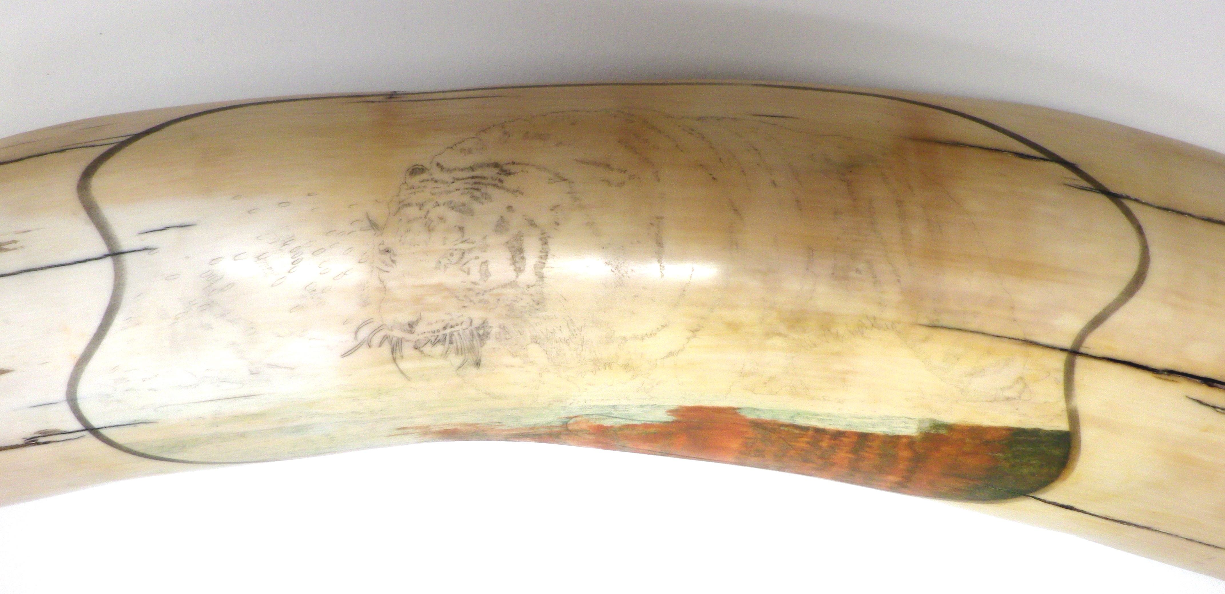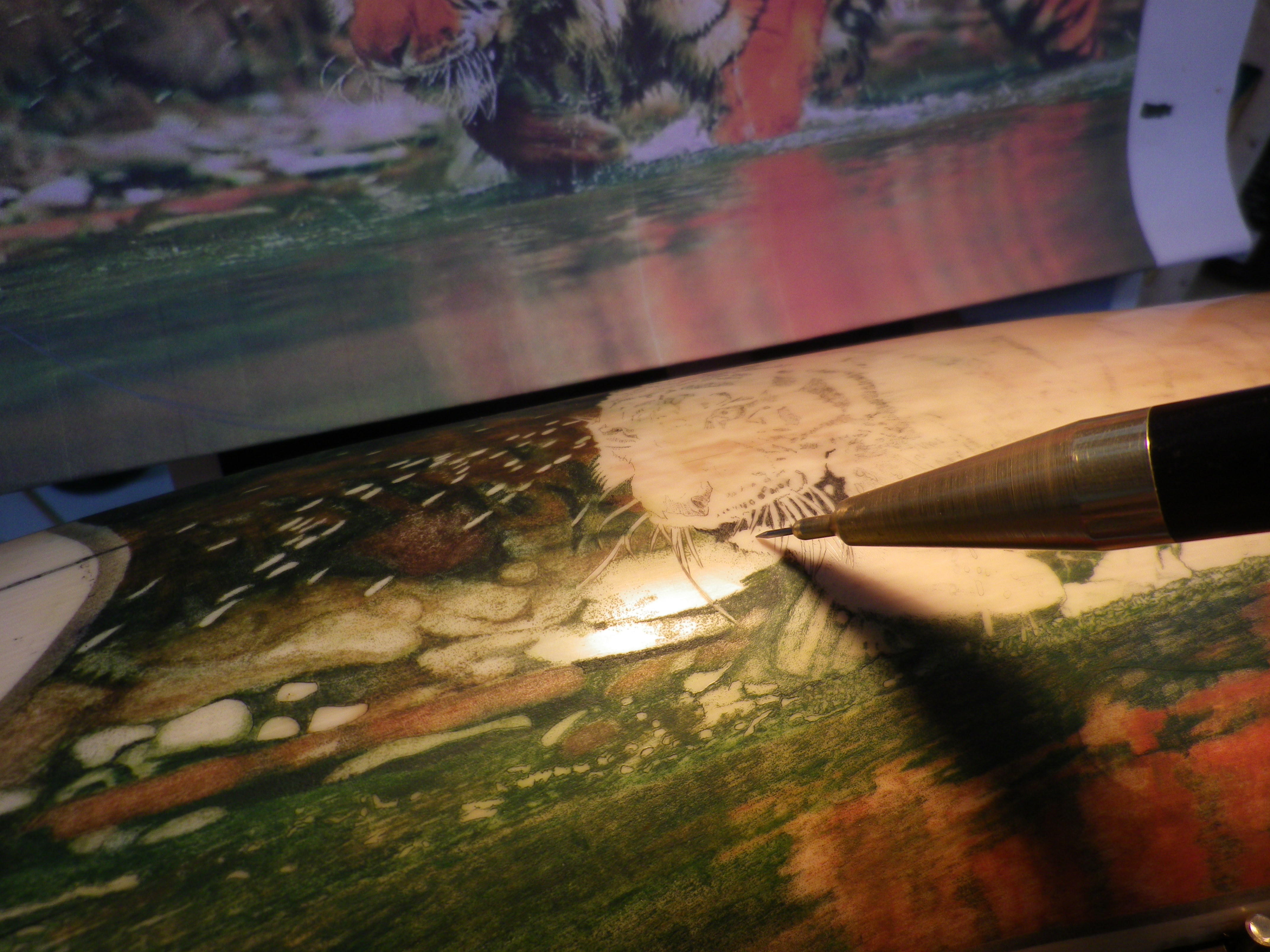 This is a Scrimshaw I recently completed– a tiger running through water on mammoth ivory.